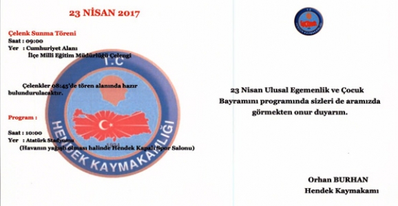23 Nisan Ulusal Egemenlik ve Çocuk Bayramı Programı hava şartlarının yağışlı ve soğuk olması tahmin edildiğinden Hendek Yeni Kapalı Spor Salonunda yapılacaktır.