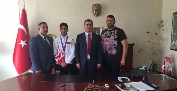19-29 Mayıs 2016 tarihleri arasında İsveç’te düzenlenen Muay-Thai Dünya Şampiyonası Büyük Erkekler 54 Kg’da Dünya Üçüncüsü olan Emrah Atış Milli Takım Antrenörü Murat Tokat ve Hendek Muay-Thai Spor Kulübü Antrenörü Erkan Yılmaz ile birlikte Hendek Kaymakamı İdris Akbıyık’ı makamında ziyaret ederek, maddi manevi desteklerinden dolayı teşekkür etti.