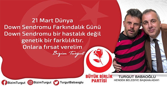 BBP Hendek Belediye Başkan Adayı Turgut Babaoğlu, 21 Mart Dünya Down Sendromu Farkındalık Günü nedeniyle bir mesaj yayınladı.
