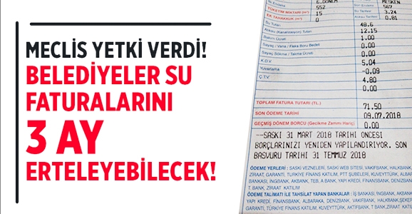 Meclis'te yapılan düzenlemeyle, Belediyelere su faturalarını 3 ay erteleme yetkisi verildi.