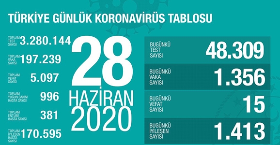 28 Haziran tarihine ait verileri paylaşan Koca, 48 bin 309 test yapıldığını, vaka sayısının 1356 olduğunu ve toplam 15 kişinin vefat ettiğini duyurdu.