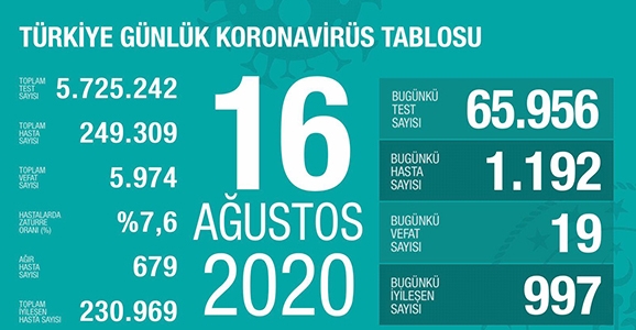 16 Ağustos tarihine ait verileri paylaşan Koca, 65 bin 956 test yapıldığını, hasta sayısının 1192 olduğunu ve toplam 19 kişinin vefat ettiğini duyurdu.