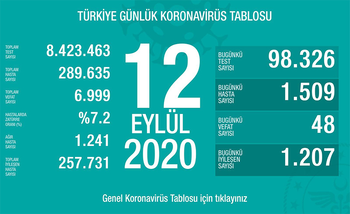 12 Eylül tarihine ait koronavirüs verilerine göre, 98 bin 326 test yapıldığı, hasta sayısının 1509 olduğu ve toplam 48 kişinin vefat ettiği duyuruldu.