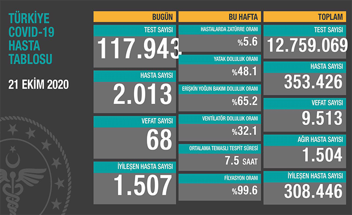 21 Ekim tarihine ait koronavirüs verilerine göre, 117 bin 943 test yapıldığı, hasta sayısının 2013 olduğu ve toplam 68 kişinin vefat ettiği duyuruldu.