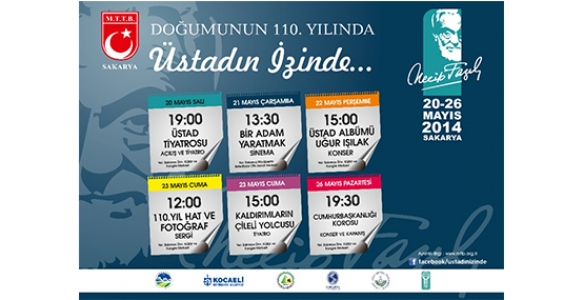 Milli Türk Talebe Birliği Sakarya İl Başkanlığı tarafından 20-26 Mayıs tarihleri arasında düzenlenecek Necip Fazıl Kısakürek’i anma etkinliklerinin takvimi belirlendi. “Doğumunun 110. Yılında Necip Fazıl” etkinliklerinde tiyatro ve sinema gösterimlerinden, hat ve fotoğraf sergilerine kadar birçok etkinlik Sakaryalılarla buluşacak. Ayrıca etkinlik takvimi kapsamında sanatçı Uğur Işılak Konseri de düzenlenecek. MTTB İl Başkanlığı’ndan yapılan açıklamada; etkinliklere tüm Sakaryalılar davet edilirken, ayrıntılı bilgi almak isteyenlerin www.mttb.org. tr internet sayfasını ziyaret edebileceği belirtildi. Açıklanan etkinlik takvimi ise şöyle;