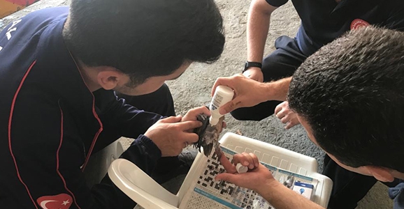 Korkan yavruya elleriyle su içiren itfaiyeciler daha sonra yaralı kumruyu veterinere teslim ettiler.