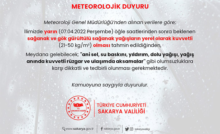 Sakarya Valiliği’nin “Vatandaşlarımızın Dikkatine” başlıklı uyarısında, Meteoroloji verilerine göre; İlimizde yarın (7 Nisan) öğleden sonra gök gürültülü ve yerel olarak kuvvetli sağanak yağış beklenmektedir. Olumsuz hava koşullarında yaşanabilecek durumlara karşı dikkatli/tedbirli olunması gerekmektedir” ifadelerine yer verildi.