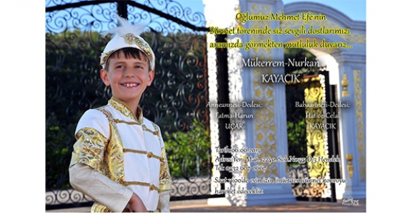 Hendek Belediyesi Karate Takımı Antrenörlerinden Nurkan Kayacık ve Mükeremm Kayacık' ın oğlu Mehmet Efe Kayacıkiçin 6 haziran 2015 cumartesi günü sünnet töreni yapıyor.