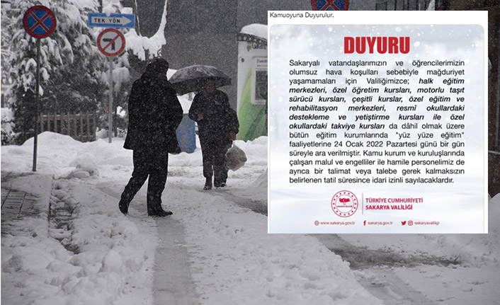 Valilik resmi sosyal medya hesabından yapılan açıklamaya göre; 24 Ocak Pazartesi günü faaliyet gösteren kurslarda eğitime ara verildi. Valilik’ten yapılan açıklama şöyle; “İlimizde etkisini sürdüren olumsuz hava koşulları sebebiyle, 24.01.2022 Pazartesi günü bütün eğitim kurumlarında yüz yüze eğitim faaliyetlerine 1 (Bir) gün süreyle ara verilmiştir.”