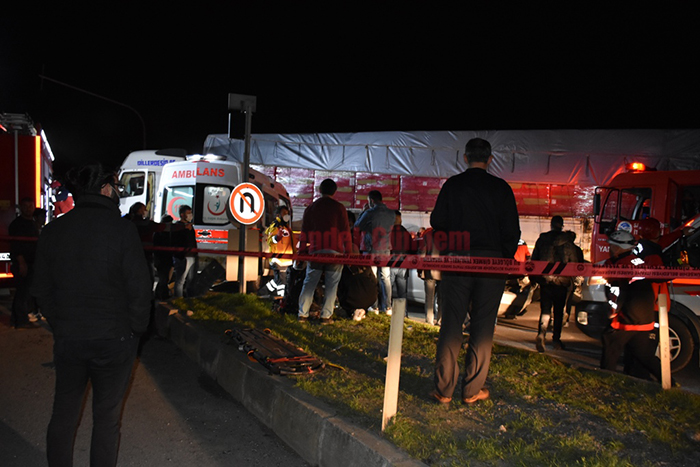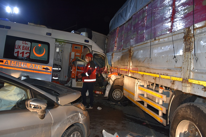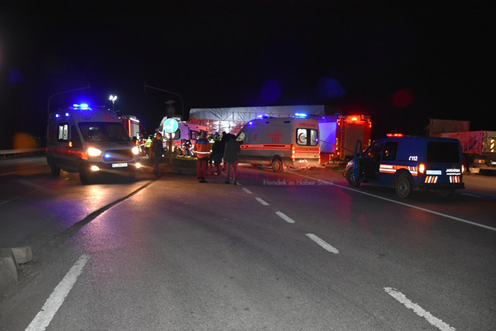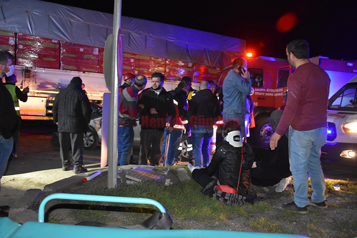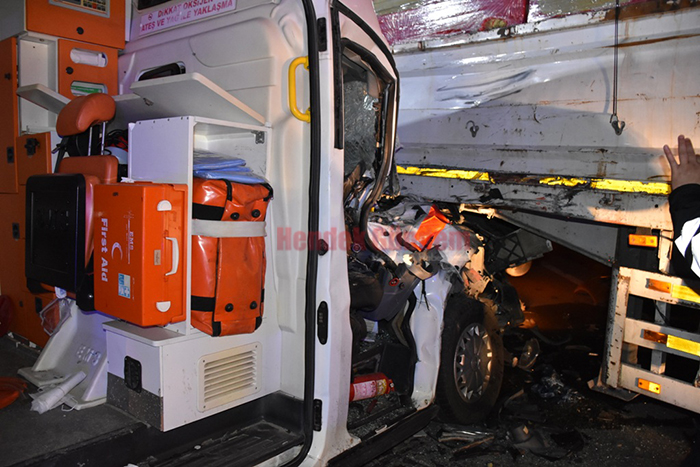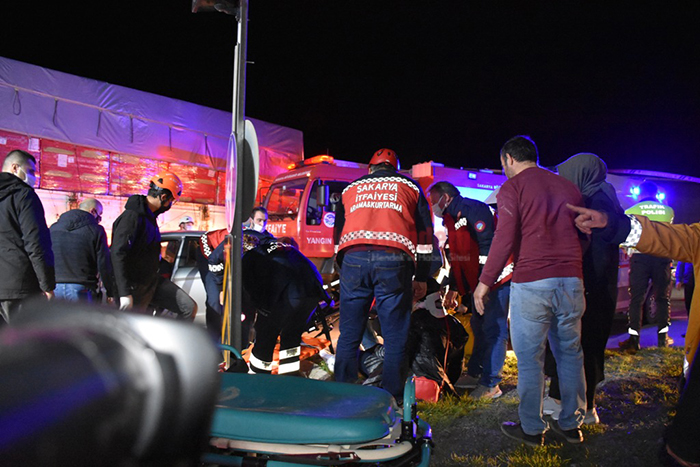 Edinilen bilgilere göre, Hendek’ten Adapazarı istikametine hasta nakli yapmakta olan 54 E… plakalı R.A. idaresindeki Ambulans ile aynı yönde ilerlemekte olan 54 KK… plakalı Y.E.U. idaresindeki otomobil, Hendek Kargalı Hanbaba Mevkii kontrolsüz kavşağında Adapaarı istikametinde ilerlerken Hendek istikametine dönmek isteyen 17 ABY… plakalı S.U. idaresindeki Tır ile çarpıştı.