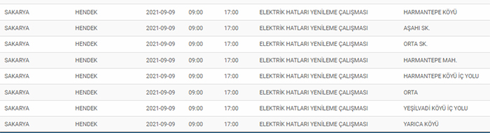 Hendek’te 9 Eylül 2021 Perşembe günü 09.00-17.00 saatleri arasında; Harmantepe Köyü, Aşahı Sk., Orta Sk., Harmantepe Mah., Harmantepe Köyü İç Yolu, Orta, Yeşilvadi Köyü İç Yolu, Yarıca Köyü.