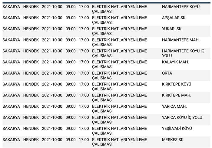 Hendek’te 30 Ekim 2021 Cumartesi günü 09.00-17.00 saatleri arasında; Harmantepe Köyü, Apşalar Sk., Yukarı Sk., Harmantepe Mah., Harmantepe Köyü İç Yolu, Kalayık Mah., Orta, Kırktepe Köyü, Kırktepe Mah., Yarıca Mah., Yarıca Köyü İç Yolu, Yeşilvadi Köyü, Merkez Sk.