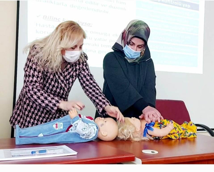 Kursiyerlerin ilgiyle katılım sağladıkları uygulamalı ve keyifli olarak devam eden eğitimde özellikle yaşam bulguları, bilinç kontrolü, Temel Yaşam Desteği (CPR) ve Kurtarıcı (Heimlich ) Manevraları gibi konularda bilgilenmeleri sağlandı.