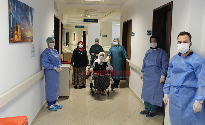 Taburcu olan Hamide Ay’ı Hendek Devlet Hastanesi sağlık personeli alkışlarla uğurladı.