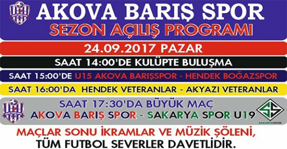 Akova Barışspor 24 Eylül Pazar günü yapacağı sezon açılış programına Hendekli tüm sporseverleri davet ediyor.
