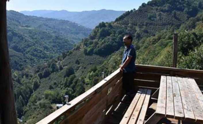 Hendekli Hasan İhtiyar, yerden 180 metre yükseklikte kendi imkanlarıyla yaptığı seyir terasında misafirlerini ağırlıyor.
