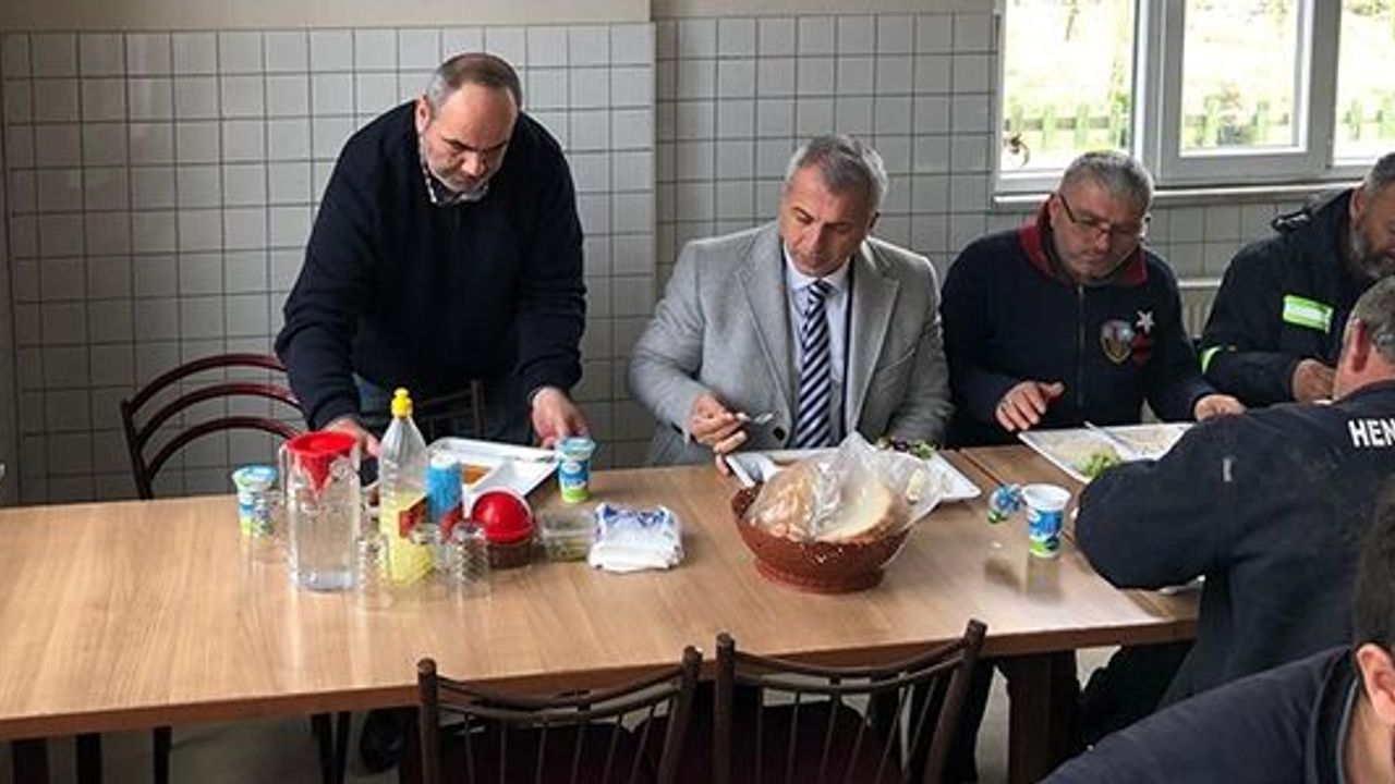 Önceki gün Belediye şantiyesini ziyaret eden Babaoğlu, aynı kuyrukta sıra bekledi ve öğle yemeğini Belediye personelleri ile birlikte yedi.