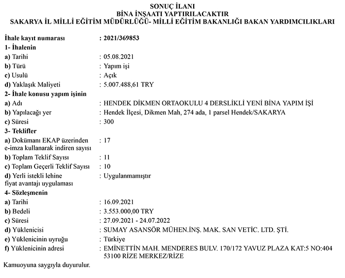 Sakarya İl Milli Eğitim Müdürlüğü’nün “2021/369853 sayılı Hendek Dikmen Mahallesi Ortaokulu 4 Derslikli Yeni Bina Yapım İşi” ihalesi sonuçlandı.