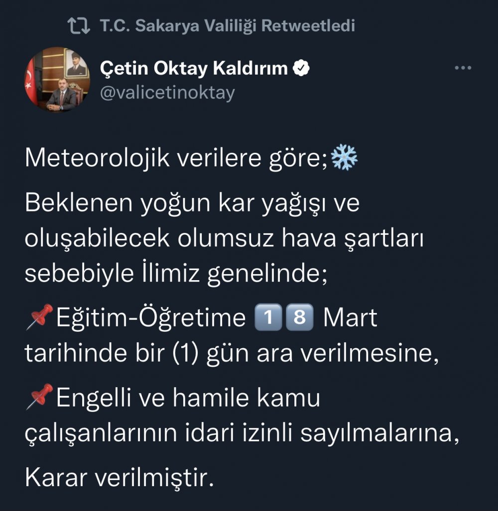Sakarya Valisi Çetin Oktay Kaldırım, sosyal medyadan yaptığı açıklamada Eğitime 1 gün ara verildiğini duyurdu.