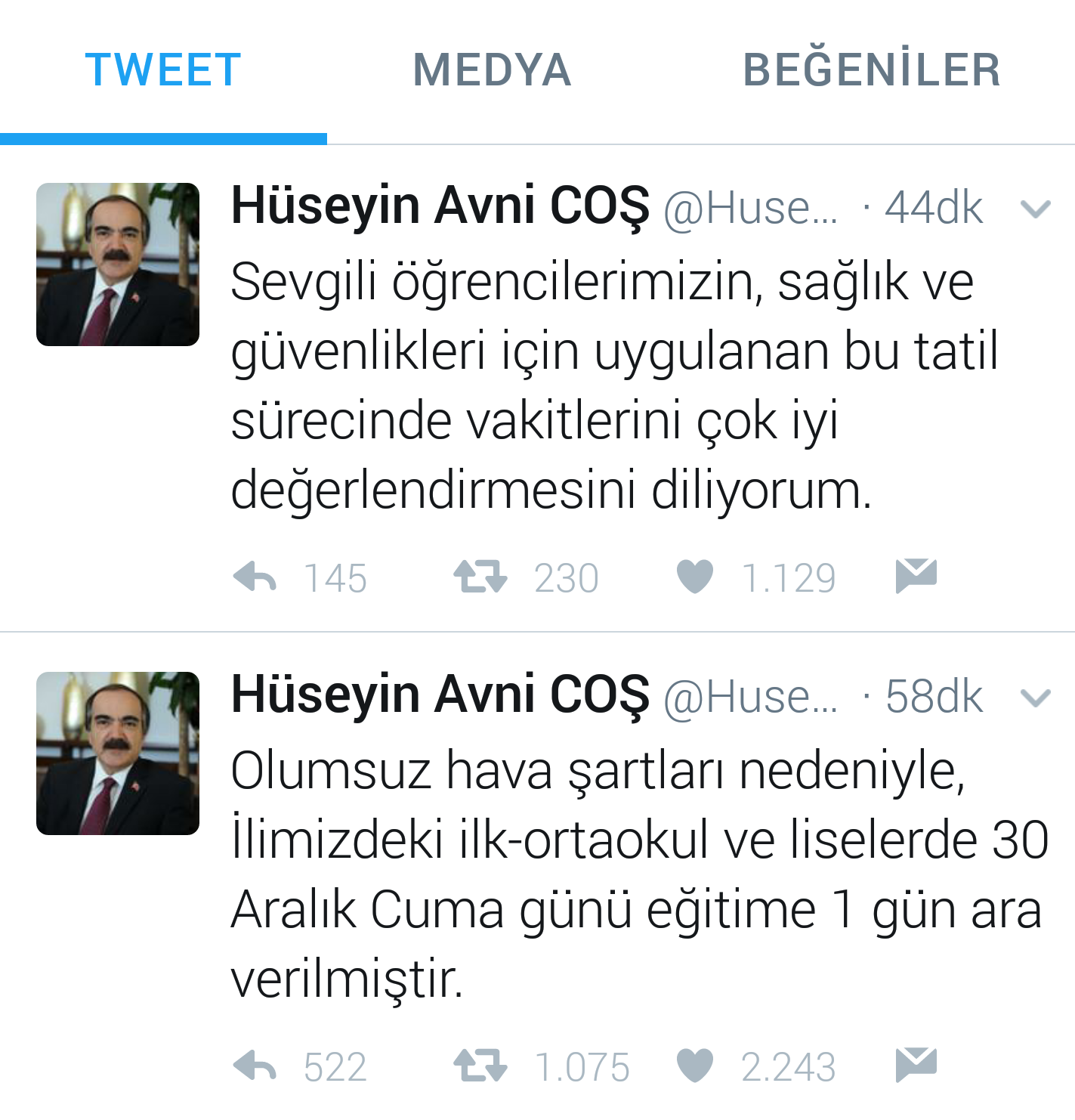 Hendek genelinde İlkokul, Ortaokul ve Liseler 30.12. 2016 Cuma günü (yarın) tatil edildİ.
