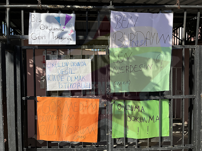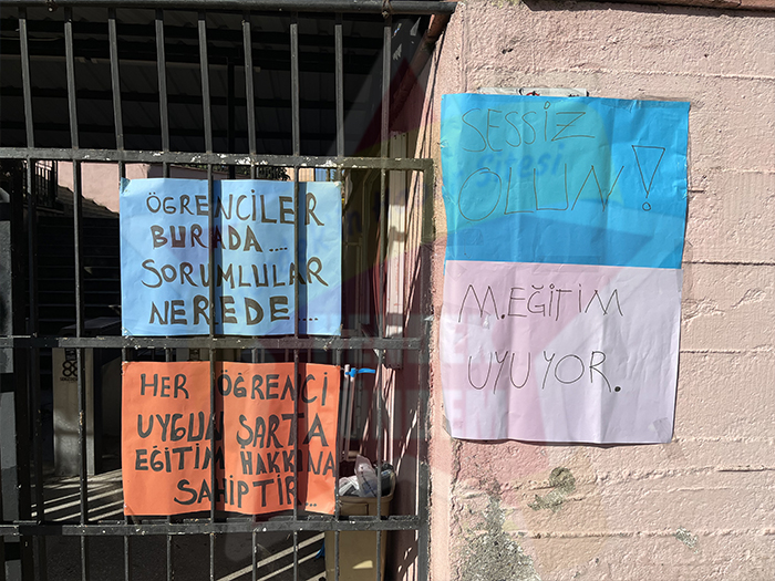 Okullarının yıkım kararı sonrası mağdur olduklarını belirten Öğrenciler hazırladıkları pankartları Okul giriş kapısına asarak tepkilerini dile getirirken, eğitim haklarının ellerinden alındığını belirttiler.