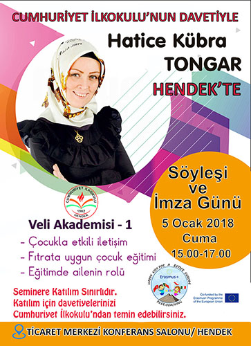 Veli Akademisinin ilk konuğu ise Hatice Kübra Tongar olacak. Velilere yönelik çocukla etkili iletişim, eğitimde aileinin rolü ve fıtrata uygun çocuk eğitimi konularında yapılacak olan seminer sonrasında kitap imza etkinliği yapılacak.