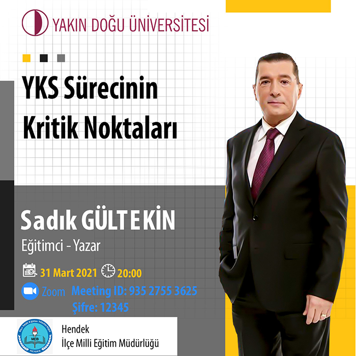 Hendek İlçe Milli Eğitim Müdürlüğü ve Yakın Doğu Üniversitesi iş birliği ile Üniversite sınavlarına hazırlanan Öğrencilere yönelik “YKS Sürecinin Kritik Noktaları” konulu seminer düzenlenecek.