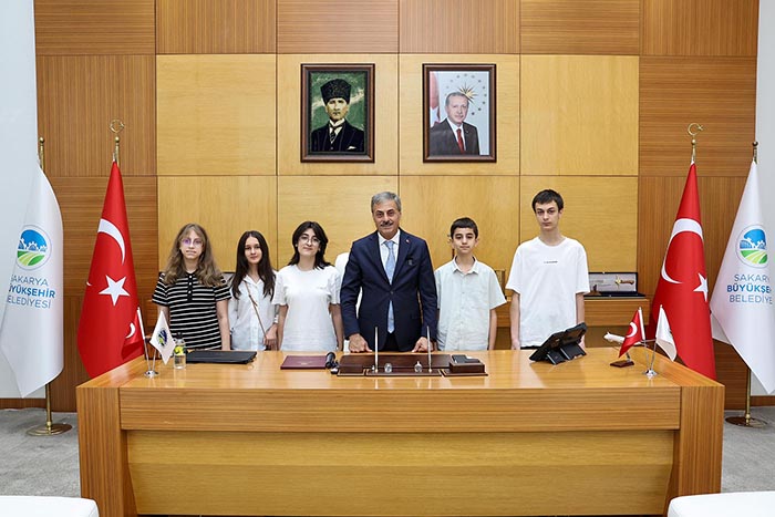 Adapazarı Sabihahanım Ortaokulu öğrencisi Ecrin Zeynep Gülez, Adapazarı Mithatpaşa Ortaokulu öğrencisi Ece Eylül Kurtuluş, Hendek Şehit Mahmutbey Ortaokulu öğrencisi Bahar Nur Güngen, Adapazarı Ahmet Akkoç Ortaokulu öğrencisi Ömer Yüksel ve Adapazarı Özel Şahin Ortaokulu öğrencisi Eren Bulut Üstün makam ziyaretinde gelecek hedeflerini anlattı.