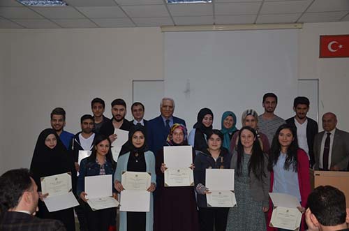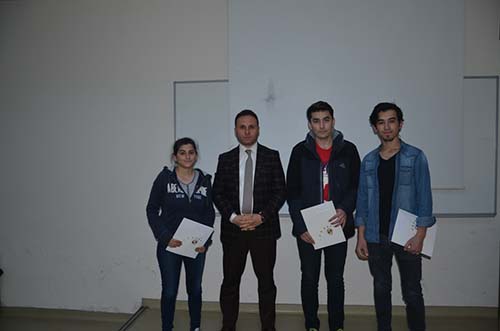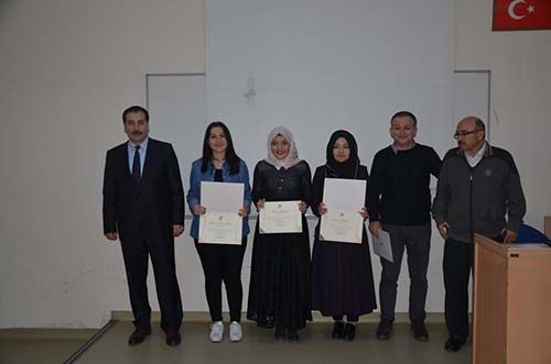 Konuşmanın ardından bölümlerinde Yüksek Onur ve Onur Belgesi alan öğrencilerin belge takdim törenine geçildi.4.00 üzerinden 4 tam not ortalaması ile dönemini birinci olarak tamamlayan Elektrikve Enerji Bölümü Öğrencisi Yüksel ARAL, 3,95 not ortalaması ile Elektronik Teknolojisi Bölümü Öğrencisi Yusuf Özer ve 3.93 not ortalaması ile Bilgisayar Teknolojileri Bölümü öğrencisi Zeynep Yıldırım’aYüksek Onur belgelerini Yüksekokul Müdürü Yrd. Doç. Dr. Beytullah Eren takdim etti ve başarılarının devamını diledi.