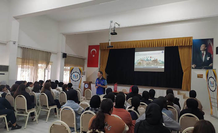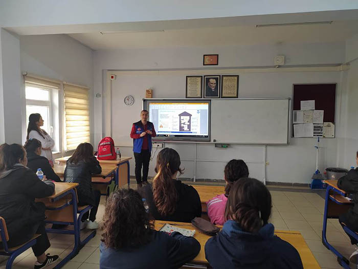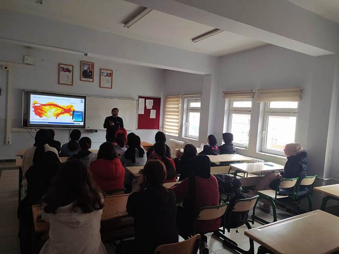 Öğrencilerin afetin ne olduğu, afet öncesi yapılacak hazırlıklar ve afet sırasında nasıl hareket edilmesi gerektiği  gibi konularda bilinçlenmesine katkı sunmak amacıyla gerçekleşen eğitimi öğrencilerin ilgiyle dinlediği görüldü.