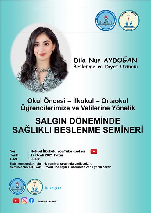Beslenme ve Diyet Uzmanı Öğretmen, veli ve öğrencilerden gelen soruları cevapladı. Seminer Noksel İlkokulu YouTube adresinden canlı yayınlandı. 17 Ocak 2021 günü saat 20.00'da yayınlanan seminerin kayıtlarını isteyenler Noksel İlkokulu'nun YouTube sayfasından izleyebilirler.