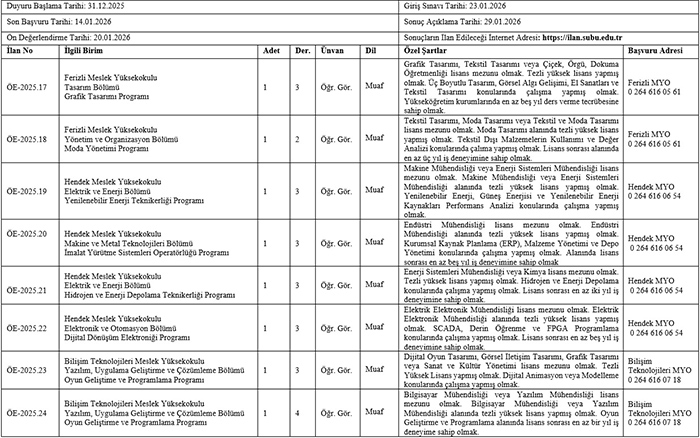 Başvuru süreci ve sonuçlar https://ilan.subu.edu.tr/ adresinden takip edilebilecek.