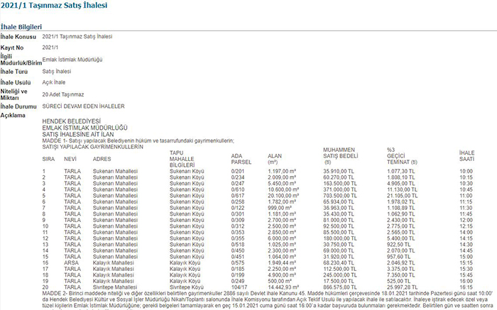 İhaleyle ilgili olarak Hendek Belediyesinden yapılan bilgilendirmede, “İhaleye iştirak edecek özel veya tüzel kişilerin Emlak ve İstimlak Müdürlüğüne; gerekli belgeleri tamamlayarak en geç 15.01.2021 Cuma günü saat 16:00`a kadar başvuruda bulunmaları gerekmektedir. Belirtilen gün ve saatten sonra yapılan başvurular kabul edilmeyecektir. İstekli olmaması durumunda ihaleler katılımcı olmadığı için yapılmamakta ve ileri tarihe ertelenmektedir. İhaleler yasal süre kapsamında ilan edilirken, sonuçlanan ve süreci devam ihalelerle ilgili tüm detaylar 2019 tarihinden itibarinden www.hendek.bel.tr adresindeki ihale rehberi kategorisinde açık bir şekilde sürekli yayınlanmaktadır. Ayrıca bilgi almak isteyen vatandaşlarımız 444 54 03 numaralı çağrı merkezini arayabilir ya da Emlak ve İstimlak Müdürlüğüne başvurabilir” denildi.