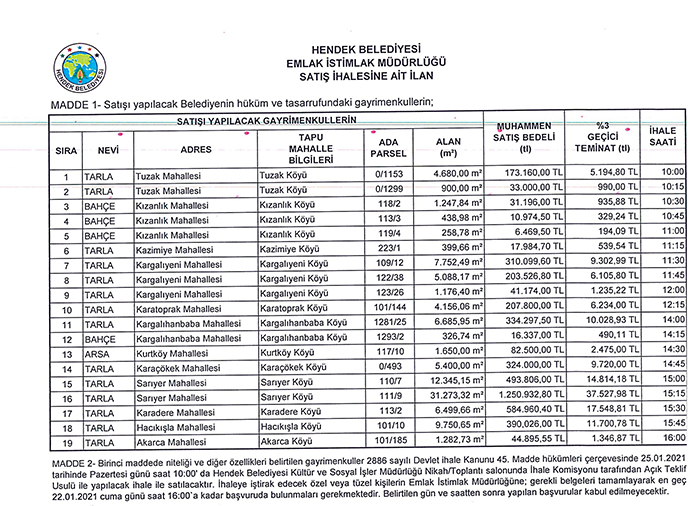 Hendek Belediyesi tarla, bahçe ve arsa vasfındaki 19 adet taşınmaz satışı için 25 Ocak 2021 Pazartesi günü saat 10.00’dan itibaren ihaleye çıkılacağını duyurdu.