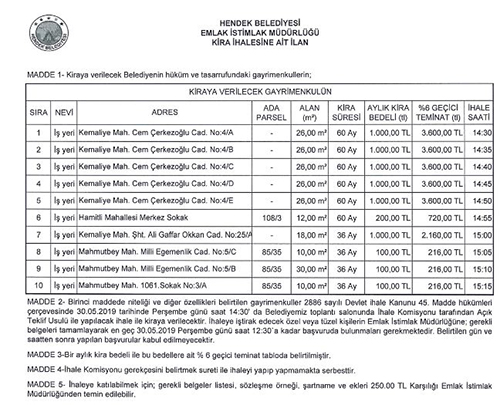 Hendek Belediyesi Toplantı Salonunda gerçekleşecek ihaleye katılmak isteyen özel ve tüzel kişilerin Hendek Belediyesi Emlak İstimlak Müdürlüğüne gerekli belgeleri tamamlayarak en geç 30 Mayıs Perşembe günü Saat: 12.30’a kadar başvuruda bulunmaları gerekmektedir.