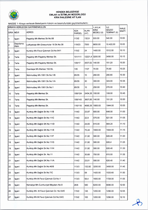 Hendek Belediyesinden yapılan açıklamada, “Hendek Belediyesinin hüküm ve tasarrufundaki gayrimenkuller olan 34 işyeri, 11 tarla, 2 beton santrali, 1 depolama alanı, 1 hamam, 1 Sosyal Tesis ve 1 adet mesken 3 yıllığına kiraya verilecek.