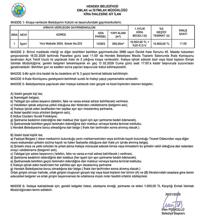 Hendek Belediyesi Emlak ve İstimlak Müdürlüğünden yapılan açıklamada 16 Şubat 2026 Pazartesi günü 2886 sayılı Devlet İhale Kanunun 45.madde hükümleri çerçevesinde yapılacak olan 1 işyeri kira ihalesi ile 1 arsanın satışıyla ilgili ihaleye çıktığı duyuruldu. Buna göre Hendek Belediyesi Meclis ve Toplantı salonunda saat 11.00’da yapılacak olan Yenimahalle 3504. Sokak No. 222’de bulunan iş yeri 3 yıllığına kiraya çıkacak.