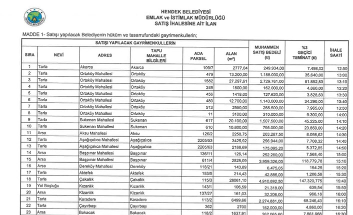 Yine aynı gün çeşitli mahallelerde bulunan arsa ve tarlalar 12.50’den itibaren satışa çıkarılacak. Yapılan açıklamada, “Akarca, Ortaköy, Su Kenarı, Aksu, Aşağıçalıca, Başpınar, Dereköy, Aktefek, Çakallık, Kızanlık, Karadere, Çayırbaşı, Bakacak ve Mahmutbey mahallerinde 2886 sayılı devlet ihale kanunun 45.madde hükümleri çerçevesinde ilan edilen tarla ve arsalar açık teklif usulü ihale ile satılacaktır. 10 Kasım Perşembe günü saat 11.30’da yapılacak ihaleler Atatürk Parkı içinde bulunan Kültür ve Sosyal İşler Müdürlüğü Nikah/Toplantı salonunda gerçekleşecek. İhaleye katılmak isteyenler 9 Kasım Çarşamba saat 16.00’a kadar belediyemiz Emlak ve İstimlak Müdürlüğüne başvuru yapılabilir” denildi.