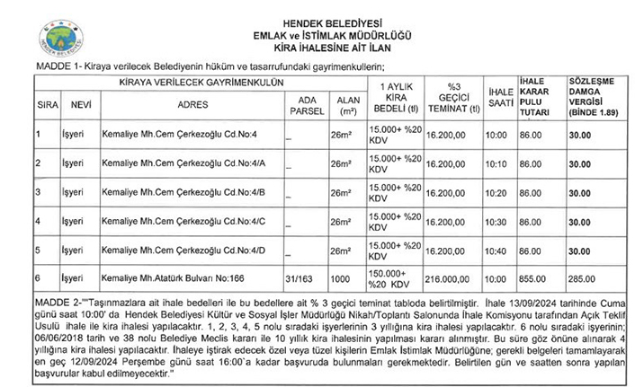 İhaleyle ilgili olarak Hendek Belediyesinden yapılan bilgilendirmede, “İhaleye iştirak edecek özel veya tüzel kişilerin Emlak ve İstimlak Müdürlüğüne; gerekli belgeleri tamamlayarak en geç 12.09.2024 Perşembe günü saat 16.00`a kadar başvuruda bulunmaları gerekmektedir.