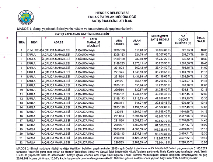 Hendek Belediyesi, Devlet İhale Kanununa uygun, açık ve şeffaf bir şekilde ihalelerini gerçekleştirmeye devam ediyor. Bu kapsamda 2886 sayılı Devlet İhale kanunun 45.maddesi hükümleri çerçevesinde Aşağı Çalıca mahallesinde 22 ayrı tarla, kuyu ve avlusu için 1 Mart 2021 Pazartesi günü Hendek Belediyesi Kültür ve Sosyal İşler Müdürlüğü Nikâh/Toplantı salonunda ihale gerçekleştirilecek.