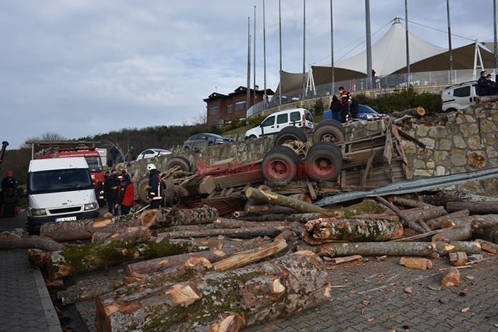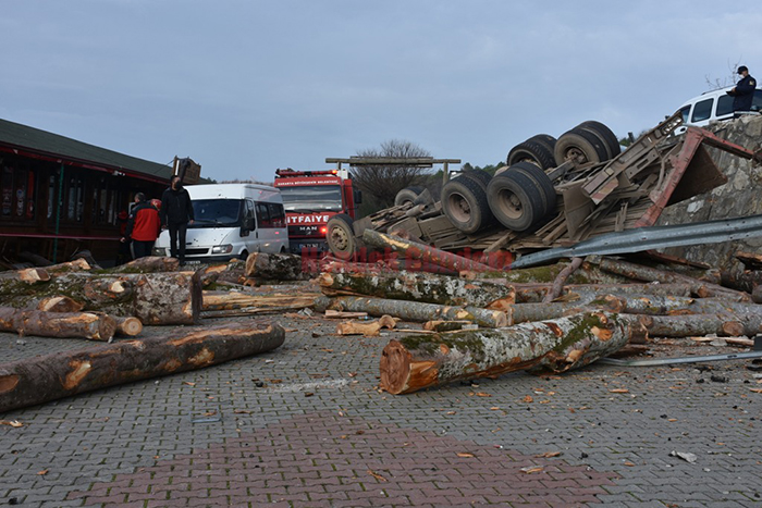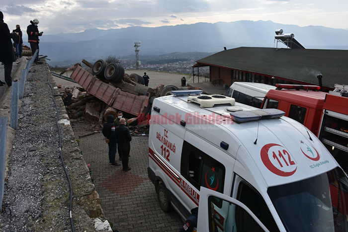 Edinilen bilgilere göre, Hendek Bayraktepe istikametinden İlçe merkezine doğru seyir halinde olan 54 YC... plakalı tomruk yüklü kamyon, Bayraktepe tesisleri kısmında bulunan virajda direksiyon hakimiyetini kaybederek 5 metre yüksekliğindeki istinat duvarı üzerinden başka bir tesisin otoparkına devrildi.