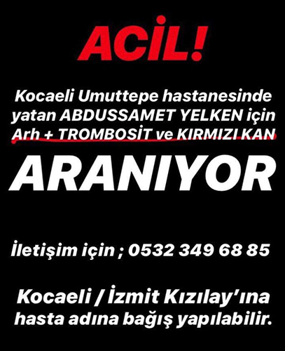 Yelken’in sosyal medya hesabından yapılan duyuruda “Acil Kocaeli Umuttepe Hastanesinde yatan Abdussamet Yelken için Arh + Trombosit ve Kırmızı Kan aranıyor. İletişim için: 0532 349 68 85 Kocaeli/İzmit Kızılay’ına hasta adına bağış yapılabilir” ifadelerine yer verildi.