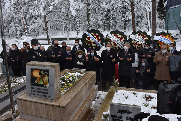 Diyarbakır Emniyet Müdürü iken 2001 yılında uğradığı hain saldırı sonucu 5 polis memuruyla birlikte şehit edilen Ali Gaffar Okkan, kabri başında dualarla anıldı. Necip Türk Milletinin gönlünde taht kuran A.Gaffar Okkan için düzenlenen anma törenine Vali Çetin Oktay Kaldırım, Büyükşehir Belediye Başkanı Ekrem Yüce, İl Emniyet Müdürü Fatih Kaya, İl Jandarma Komutanı Albay Aydın Kutlu, Sakarya Barosu Başkanı İlknur Ebiz Yıldız, Hendek Belediye Başkanı Turgut Babaoğlu, belediye başkanları, Hendek Cumhuriyet Başsavcısı Ayhan Yenilmez, siyasi partilerin ilçe başkanları, belediye meclis üyeleri, sivil toplum kuruluşlarının temsilcileri, muhtarlar, kurum müdürleri, Okkan’ın ailesi, Gaziler, Emniyet Teşkilatı ve Askeri erkan ile çok sayıda vatandaş katıldı.