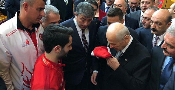 MHP Grup Başkanvekili ve Sakarya Milletvekili Muhammed Levent Bülbül, İlçe Başkanı Burhan Namlı ve Başkan Turgut Babaoğlu, MHP lideri Devlet Bahçeli’ye Avrupa Karate Şampiyonu Ömer Faruk Ateş hakkında bilgiler verdi. Yunanlı rakibini yenmesi sonrasında şanlı Türk Bayrağımızı açarak salonda tur atan Ömer Faruk Ateş, görevliler tarafından elinden alınmak istenen o bayrağı Bahçeli’ye teslim etti. Devlet Bahçeli ise o bayrağı öperek teslim aldı. Bahçeli, Ülkemize yaşattığın bu gurur için seni ve hocalarını kutluyorum. Ülkemizi başarıyla temsil eden gençlerimizle onur duyuyoruz dedi.