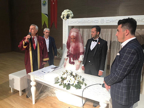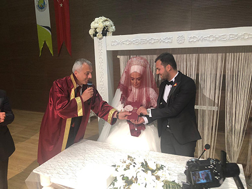 Hendek Belediye Başkanı Turgut Babaoğlu, Meryem ve Ahmet Hayırlı çiftinin biricik kızı Emine ile Fatma ve Necmi Bulca çiftinin oğlu Erol’un hayatlarını birleştirdiği cemiyette ilk resmi nikahını kıydı.