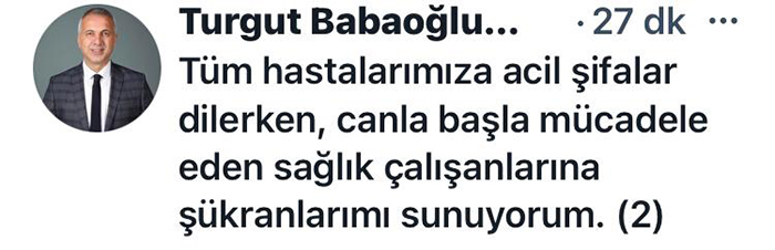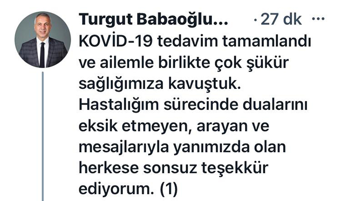 Hendek Belediye Başkanı Turgut Babaoğlu sosyal medya üzerinden yayınladığı Mesajında, kovid-19 tedavim tamamlandı ve ailemle birlikte çok şükür sağlığımıza kavuştuk Hastalığım Sürecinde dualarını esirgemeyen, arayan ve mesajlarıyla yanımızda olan herkese sonsuz teşekkür ediyorum. Tüm Hastalarımıza Acil Şifalar dilerken canla başla mücadele eden sağlık çalışanlarına şükranlarımı sunuyorum ifadelerine yer verdi.