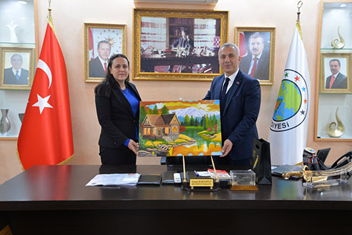 Kadın Açık Cezaevi Müdürü Funda Çekiç Koç, Başkan Turgut Babaoğlu’na, cezaevi sakinlerinin yapmış olduğu tabloyu hediye ederken, İlçe Müftü Vekili Ömer Bayaraktar da, Kuran- ı Kerim ve Türk Bayrağı hediye etti.