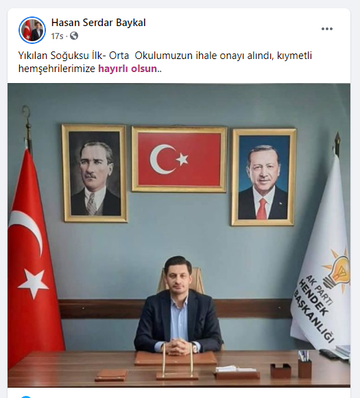 Ak Parti Hendek İlçe Başkanı Hasan Serdar Baykal Yeşilyurt Ortaokulu ile ilgili açıklama yapmazken, Sosyal medya sayfasından “Yıkılan Soğuksu İlk- Orta Okulumuzun ihale onayı alındı, kıymetli hemşerilerimize hayırlı olsun” paylaşımı Yeşilyurt Bölge halkının büyük tepkisine neden oldu.