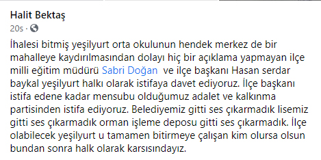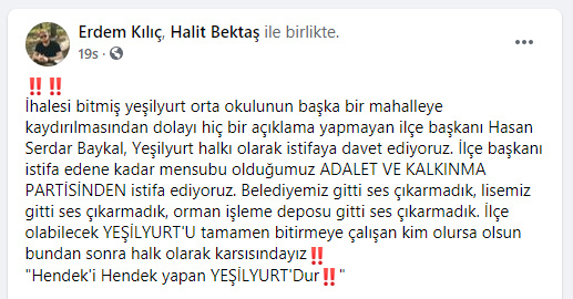 Muhtar Halit Bektaş’in kendisine ait sosyal medya hesabından yaptığı paylaşımda “İhalesi bitmiş Yeşilyurt Ortaokulunun Hendek merkezde bir Mahalleye kaydırılmasından dolayı hiçbir açıklama yapmayan İlçe Milli Eğitim Müdürü Sabri Doğan ve Ak Parti Hendek İlçe Başkanı Hasan serdar Baykal’ı Yeşilyurt halkı olarak istifaya davet ediyoruz. İlçe Başkanı istifa edene kadar mensubu olduğumuz Adalet ve Kalkınma Partisinden istifa ediyoruz. Belediyemiz gitti ses çıkarmadık, Lisemiz gitti ses çıkarmadık, orman işleme deposu gitti ses çıkarmadık. İlçe olabilecek Yeşilyurt’u tamamen bitirmeye çalışan kim olursa olsun bundan sonra halk olarak karsısındayız” ifadelerine yer verdi.