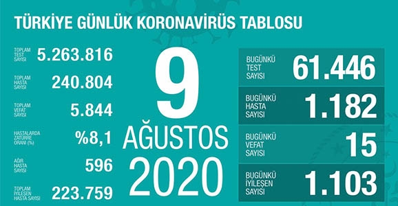 9 Ağustos tarihine ait verileri paylaşan Koca, 61 bin 446 test yapıldığını, vaka sayısının 1182 olduğunu ve toplam 15 kişinin vefat ettiğini duyurdu.